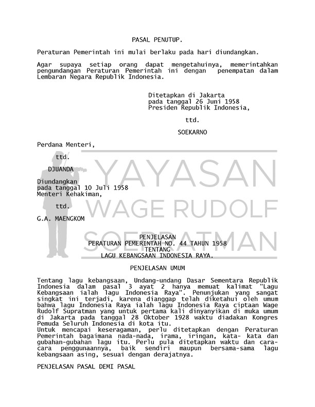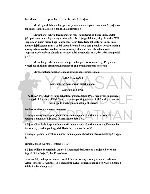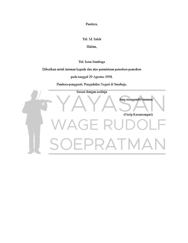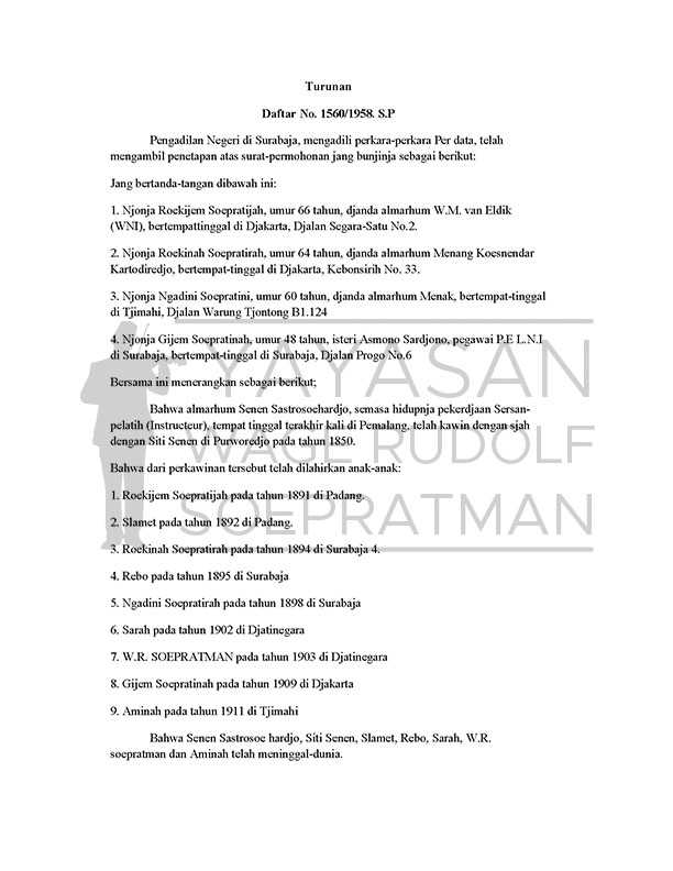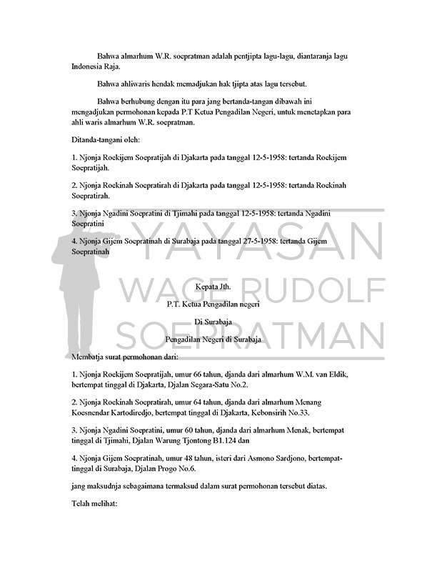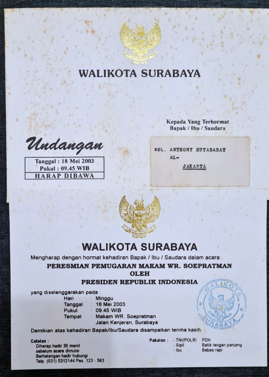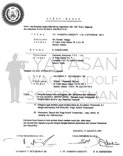 Piagam Tanda Kehormatan Bintang Mahaputra PP 58 terkait tentang Pengaturan Lagu Kebangsaan Surat Penetapan Pengadilan perihal Tempat Tanggal Lahir WR Soepratman Apresiasi BANK INDONESIA mata uang Rupiah bergambar WR.SOEPRATMAN pecahan Uang 50.000, dengan seri: WRS 090303 diberikan kepada ANTHONY C. HUTABARAT, SH Silsilah langsung Keluarga Besar WR Soepratman Galeri Foto Keluarga dan Yayasan Bu RoekiyemBu Roekiyem dan AugustianiAnthony & AugustianiAugustiani & Biola WRSBpk Anthony & Biola Wage Rudolf SoepratmanBu NgadiniKeluarga Bu Ngadini. Depan: Roy, Bewita, Augustiani, ImeldaMakam Ayahanda WRS Makam Orangtua WRS setelah dipugarMakam WRS setelah dipugarRoy, Indra, Bu Augustiani, BewitaZiarah ke makam Bu Roekiyem, Kakak pertama WRS dan Bu Ngadini, Kak kelima WRSAugustiani MuseumKunjungan ke Museum WR. Soepratman Jl. Mangga, SurabayaPenetapan Biola WRS tetap di Muesum Sumpah PemudaPermintaan Pembuatan Nama Jalan & Patung WRS ke DPR Komisi X bersama pak Dede JusufKunjungan Direktur Departemen Pengelolaan Uang BANK INDONESIA (BI) Bpk HARI WIDODOMARDINA DERIATY dan suami Anak NGADINI, Kakak ke 5 WR.SOEPRATMANFestival Rupiah Berdaulat IndonesiaUndangan Pemugaran Makam WRSReuni Keluarga Besar WRS 2017Reuni Keluarga Besar WRS 2017 B BERANDA SEJARAH GALERI ARTIKEL Perjuangan Keluarga mengabadikan Nama Jalan dan Patung Wage Rudolf Soepratman Wage Rudolf Soepratman, tetap membujang hingga akhir hayat Berontak di Kapal Perang Belanda De Zeven Provincien Biola Buatan Nicolo Amati Menjadi Cagar Budaya Nasional KONTAK E-Book BERANDA SEJARAH GALERI ARTIKEL Perjuangan Keluarga mengabadikan Nama Jalan dan Patung Wage Rudolf Soepratman Wage Rudolf Soepratman, tetap membujang hingga akhir hayat Berontak di Kapal Perang Belanda De Zeven Provincien Biola Buatan Nicolo Amati Menjadi Cagar Budaya Nasional KONTAK E-Book